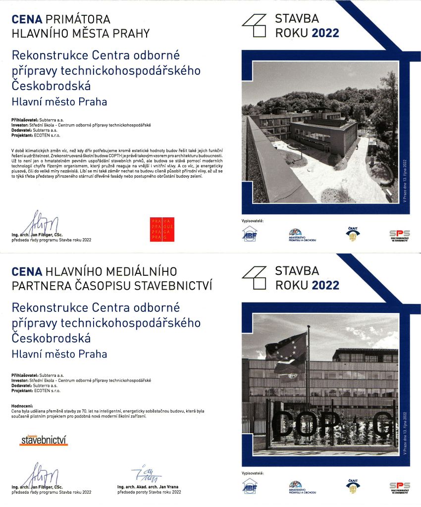 Revitalizovaná pražská školní budova, která byla otevřena 1. září 2022, obdržela zvláštní Ocenění primátora hlavního města Prahy a Cenu hlavního mediální partnera časopisu Stavebnictví v rámci soutěže Stavba roku 2022, jejíž výsledky byly zveřejněny 15. října 2022. Projektantem přeměny stavby ze 70. let na provozně energeticky a uhlíkově pozitivní školní budovu byla společnost ECOTEN.